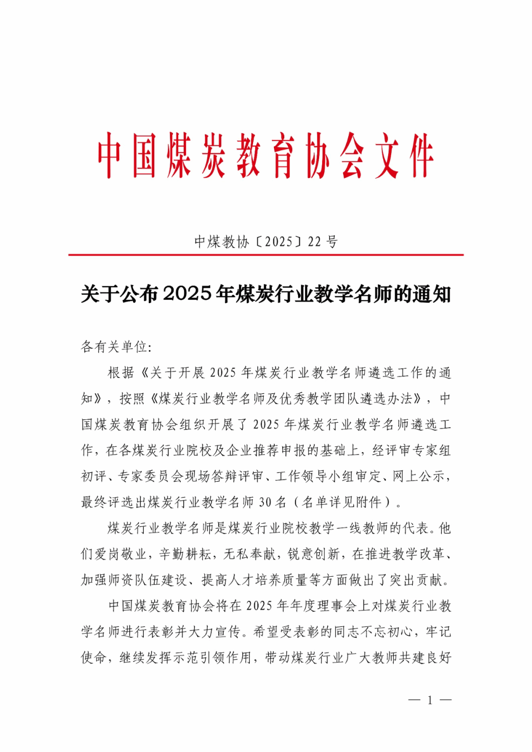 近日,中国煤炭教育协会公布了2025年煤炭行业教学名师评选结果,学院李喜林教授荣获“全国煤炭行业教学名师”称号。本次遴选由中国煤炭教育协会、全国煤炭职业教育指导委员会组织,经推荐、评审、答辩与公示,最终评选出“全国煤炭行业教学名师”30名(其中普通高等院校18名)。