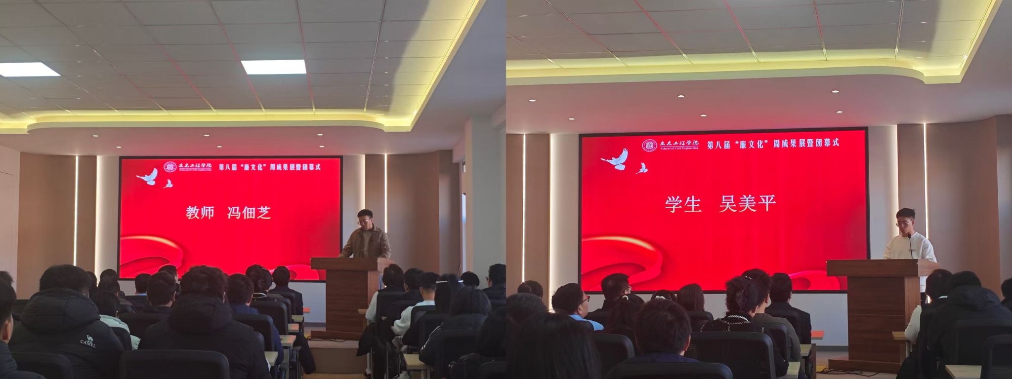 道路与桥梁工程系师生联合党支部书记冯佃芝和学生第四党支部纪律委员、建筑22-3班学习委员吴美平分别作为教师和学生代表进行了发言,他们表示本次“廉文化”周系列活动让自己对廉洁有了更深刻的认知,将把清廉种子播撒于心,在日常生活中严于律己,自觉抵制不良风气,争做廉洁修身的践行者与传承者。