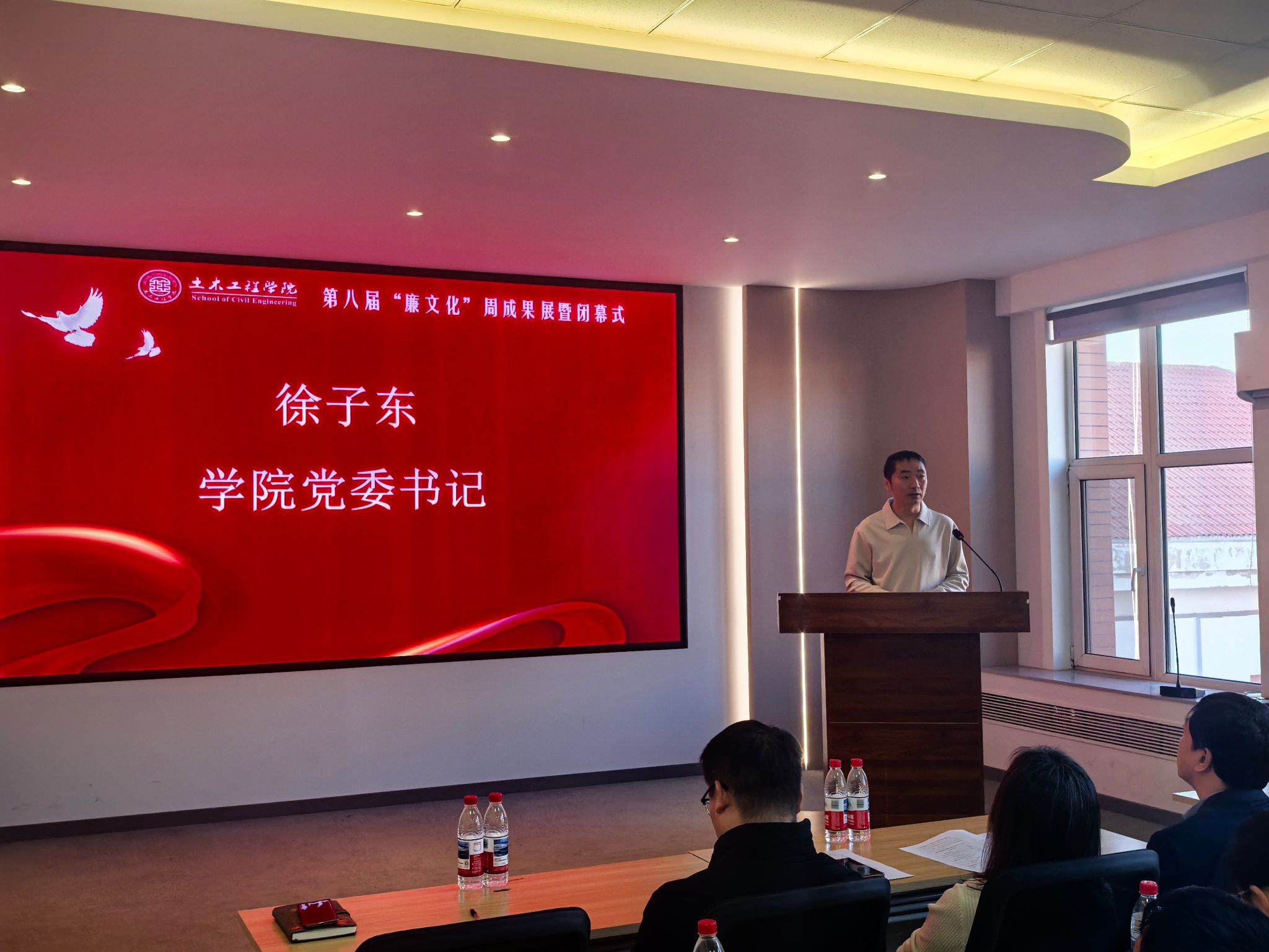 学院党委书记徐子东进行总结讲话,强调了廉洁文化建设的长期性和重要性,并对学院全体师生提出了希望,号召以此次“廉文化”周系列活动为新的起点,持续传承廉洁基因,弘扬廉洁清风,以廉洁之姿护航学生成长之路,以清风之气助推学院高质量发展,共同书写土木工程学院立德树人内涵发展的新篇章。
