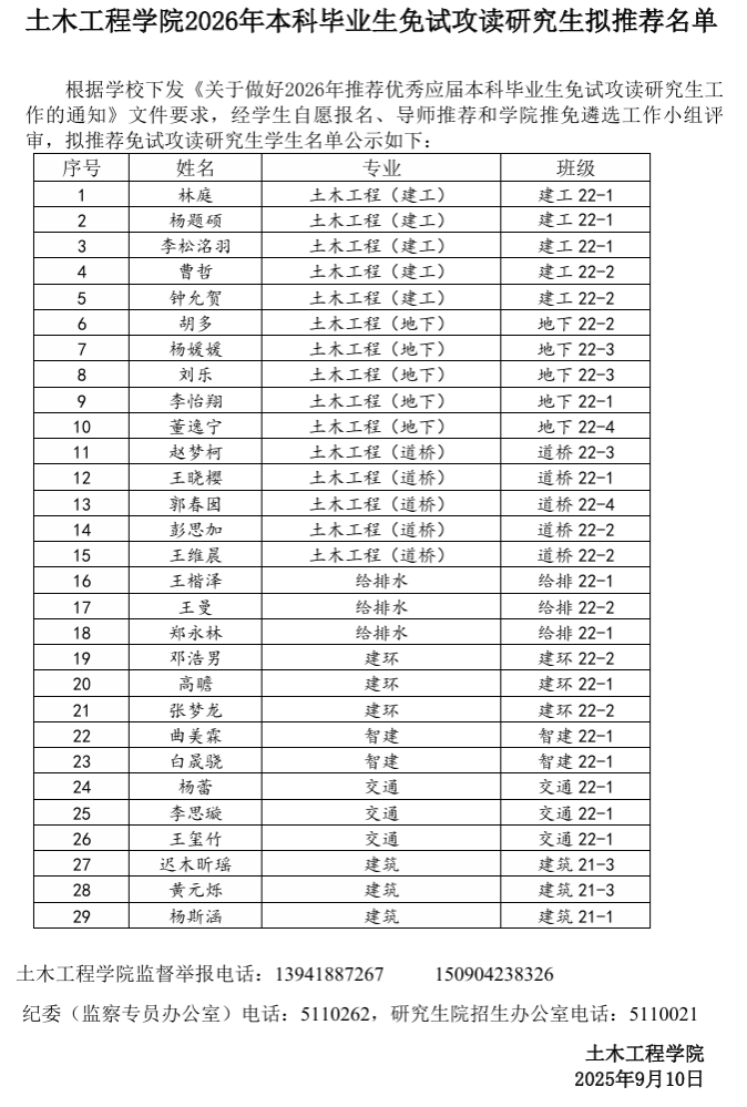 土木工程学院2026年本科毕业生免试攻读研究生拟推荐名单
